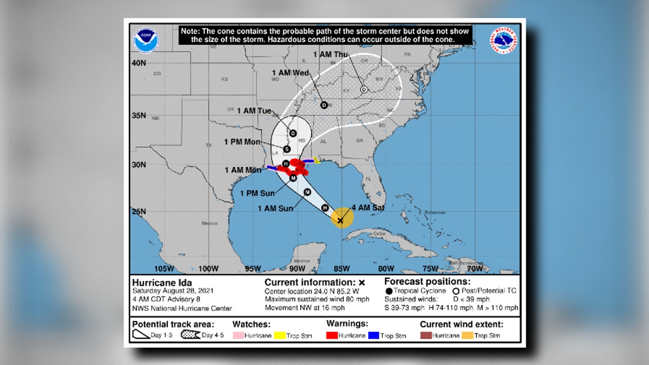 The white outline shows the projected path for the storm. Ida is forecast with high. Dangerous storm surge and hurricane winds are expected with New Orleans in the projected path.